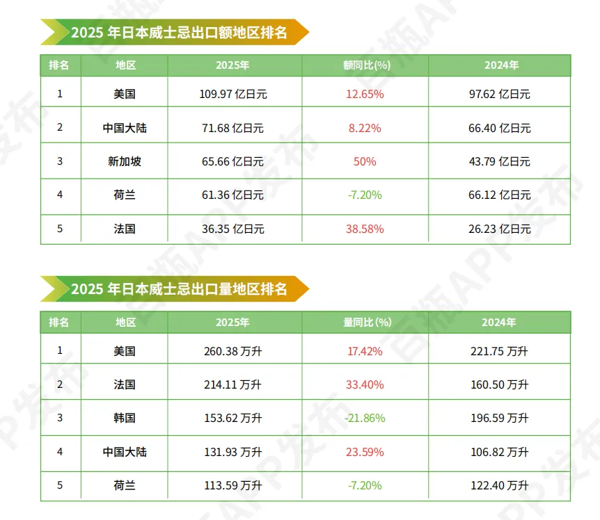 全球格局重构:2025年,苏格兰威士忌全球出口额相对平稳,出口量下降4.3%,印度成第一大出口市场;日本威士忌全球出口实现量额双增,同比去年分别增长20.1%、12.3%;爱尔兰威士忌全球出口额同比下滑5%。