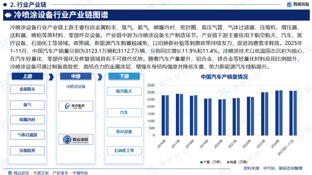 行业发展有利因素:技术端,冷喷涂低温固态沉积特性避免热影响,保持材料本征性能,在关键部件修复、高性能涂层制备领域具有不可替代性。需求端,航空航天、新能源汽车、医疗设备等领域对高性能、低热影响技术的需求迫切,2025年汽车产销量同比增长超11%,带动轻量化部件喷涂需求。产业链端,上游材料价格波动加速下游对综合解决方案(设备+工艺+材料)的追求,推动行业竞争模式升级。