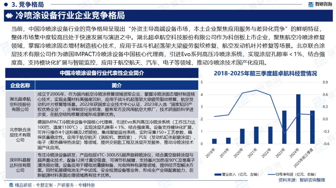 竞争情况:当前,中国冷喷涂设备行业的竞争格局呈现出“外资主导高端设备市场,本土企业聚焦应用服务与差异化竞争”的鲜明特征,整体市场集中度较高且处于快速发展与演进之中。湖北超卓航空科技股份有限公司作为科创板上市企业,聚焦航空冷喷涂修复领域,掌握冷喷涂固态增材制造核心技术,应用于战斗机起落架大梁疲劳裂纹修复、航空发动机叶片修复等场景。北京联合涂层技术有限公司作为德国IMPACT冷喷涂设备中国核心代理商,引进Evo系列高压冷喷涂系统,实现涂层孔隙率<1%、结合强度高,支持模块化扩展与智能监控,应用于航空航天、汽车、电子等领域,推动冷喷涂技术国产化应用。