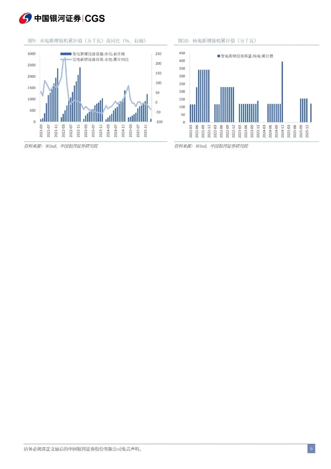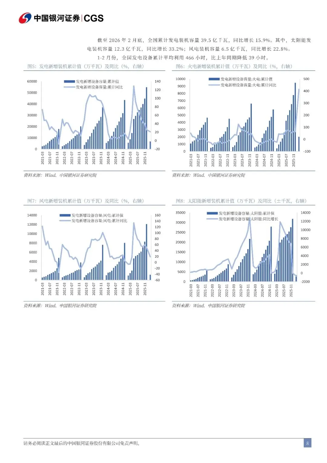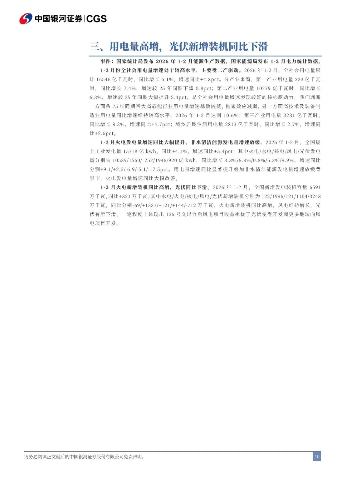 关注算电协同下发电企业的价值重估。《2026年政府工作报告》提出要"实施超大规模智算集群、算电协同等新基建工程"。与此同时,根据全球最大的AI模型API聚合平台OpenRouter数据,2026年2月9日~13日这周,中国模型以4.12万亿Token的调用量,首次超过美国模型的2.94万亿Token;16日~22日这周,中国模型的调用量进一步冲高至5.16万亿Token,美国模型调用量跌至2.7万亿Token;体现出中国模型的性价比优势。由于数据中心运营成本中电费占比达到28%(若不考虑固定资产折旧进一步提升至38%),因此,中国大模型的性价比优势在一定程度上来自国内的电价优势,由此引发"国内电力借由token实现出海"的宏大叙事。限据中国信通院数据,2023、2024年我国数据中心用电量分别为1500、1660亿千瓦时,同比增长15%、11%,尽管占全社会用电量的比例仅1.6-1.7%,但其增速明显快于全社会用电量增速,未来数据中心用电量增长将成为全补士会用电量增长的核心驱动力之一,所有类型的发电企业均有望受益。但考虑到国内政策明确国家枢纽节点新建数据中心绿电使用比例需超过80%,且不同类型电源的电价水平存在明显差异,电价更具优势的新能源、水电等或更为受益,有望迎量价齐升的新发展机遇。