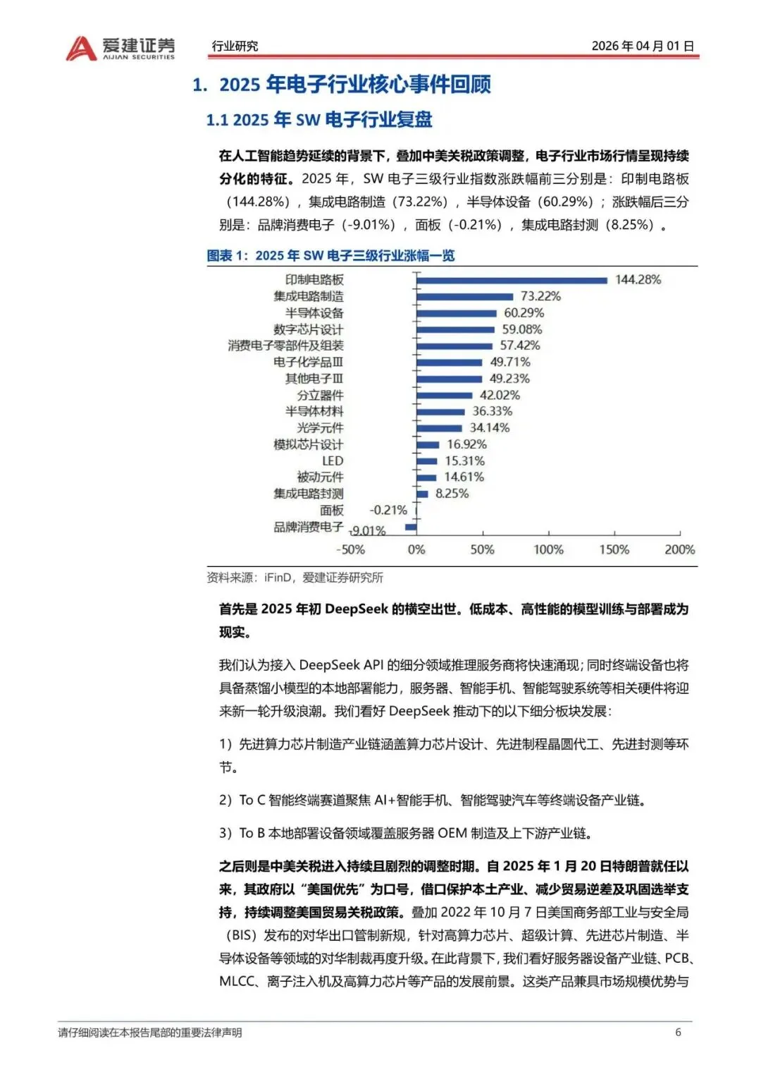 复盘 2025 年,SW 电子三级行业指数表现分化显著。涨幅前三的细分领域依次为印制电路板(144.28%)、集成电路制造(73.22%)、半导体设备(60.29%);涨幅靠后的三个细分领域则是品牌消费电子(-9.01%)、面板(-0.21%)、集成电路封测(8.25%)。