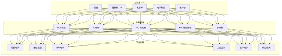 上游:原材料集中度高,技术壁垒强 中游:PCB 制造分散,头部效应明显 下游:应用领域广泛,需求多元化