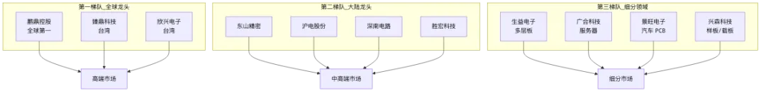 头部集中:全球前十大 PCB 厂商占据约 40% 市场份额 区域集聚:中国大陆、台湾、日本、韩国是主要生产基地 技术分层:高端 IC 载板、HDI 由台系、日系主导,大陆厂商追赶 应用分化:不同厂商聚焦不同下游应用领域