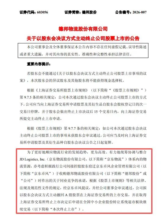 2026年1月9日,德邦股份宣布紧急停牌,表示间接控股股东京东卓风正在筹划重大事项。1月13日,德邦股份公告,拟以股东会决议方式主动撤回其A股股票在上海证券交易所的上市交易,3月31日,德邦股份完成摘牌,成为2026年首家主动退市的A股公司。