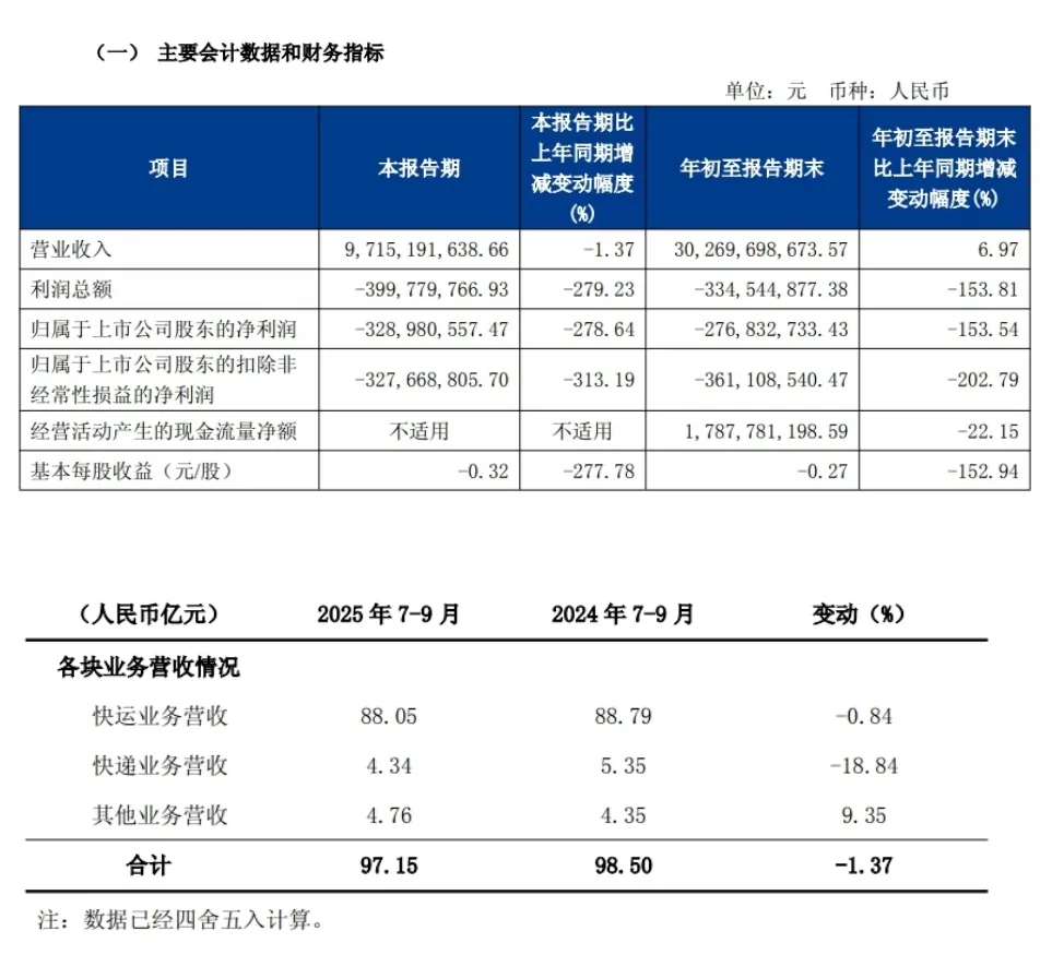 然而,随着京东系管理层的全面接手,德邦的业绩还是出现了波动。2025年前三季度,公司实现营收302.70亿元,同比增长6.97%,但归母净利润却亏损2.78亿元,这是公司上市后首次在三季报出现亏损。