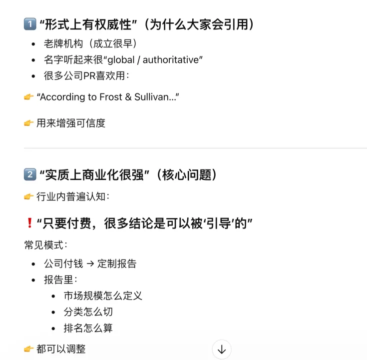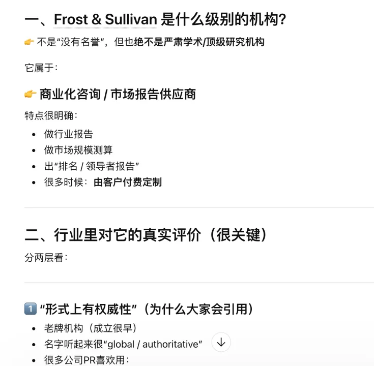 查询了何谓沙利文权威报告,ChatGPT回答:沙利文属于商业化咨询/市场报告供应商。很多时候:由客户付费定制。行业内普遍认知:只要付费,很多结论是可以被引导的。