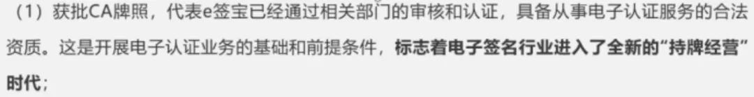 e签宝在文中宣称电子签行业进入持牌时代,并提出没有CA资格认证(电子认证)的企业会没有生存空间: