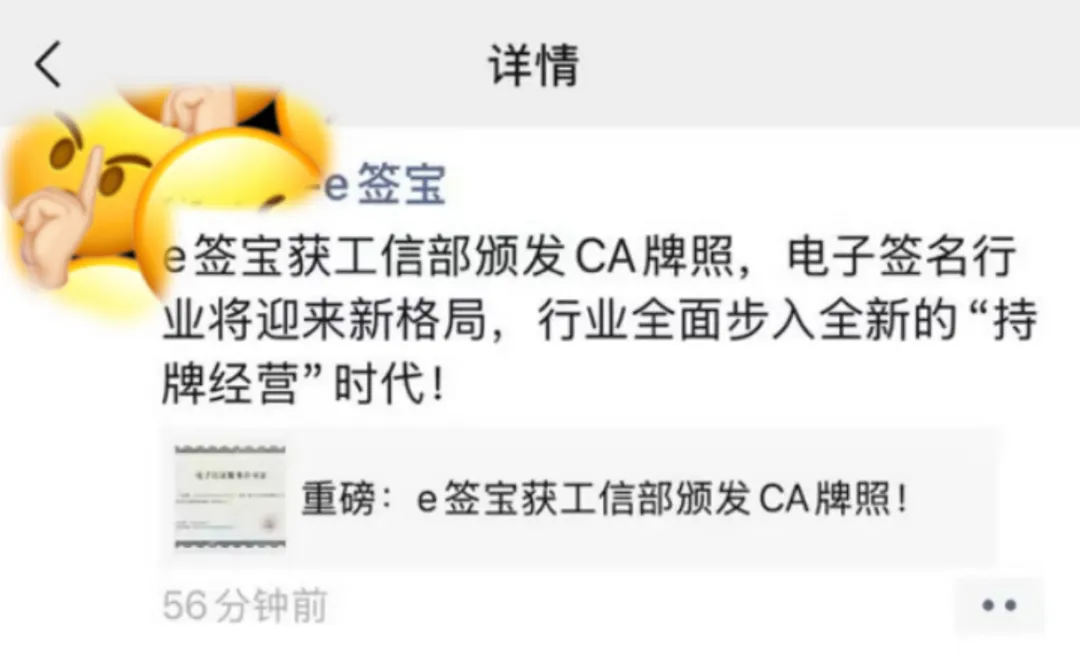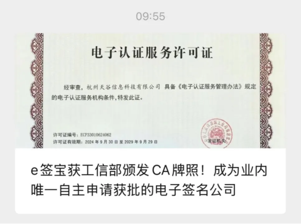 2025年10月24日,e签宝公众号对外发文《重磅:e签宝获工信部颁发CA牌照》1。