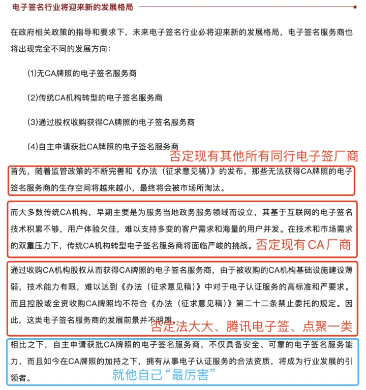 而所谓的电子签约行业需要CA数字认证的资质,只是做了错误决策的电子签约厂商忽悠不懂行的投资人的借口。