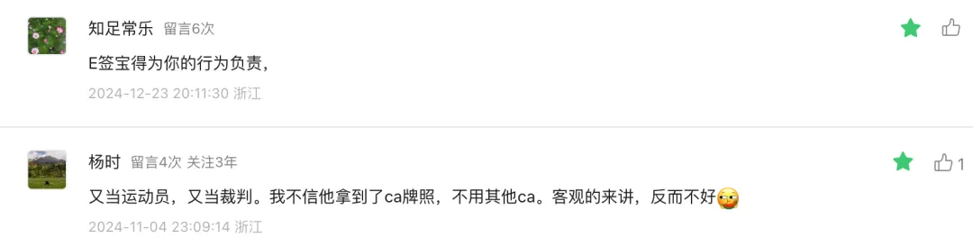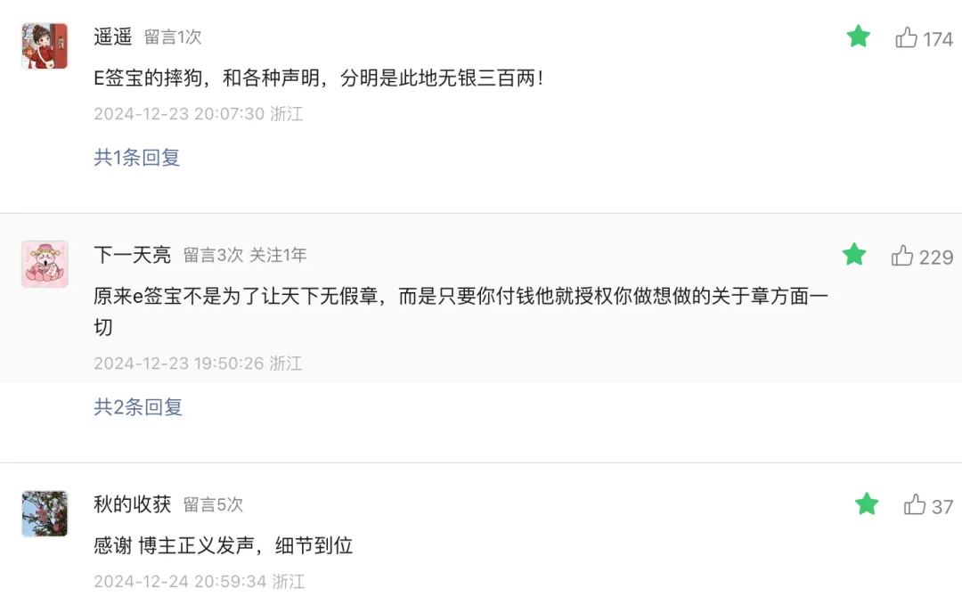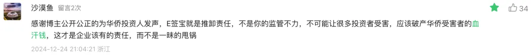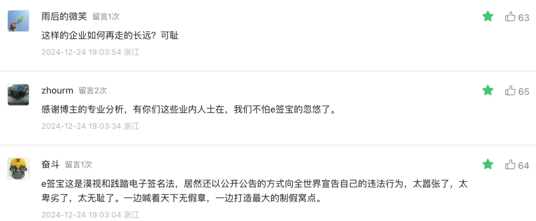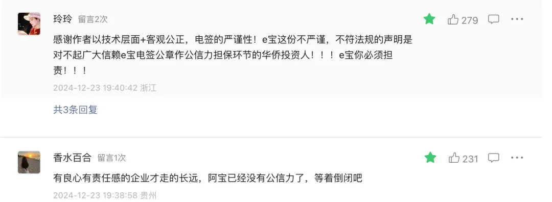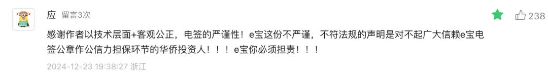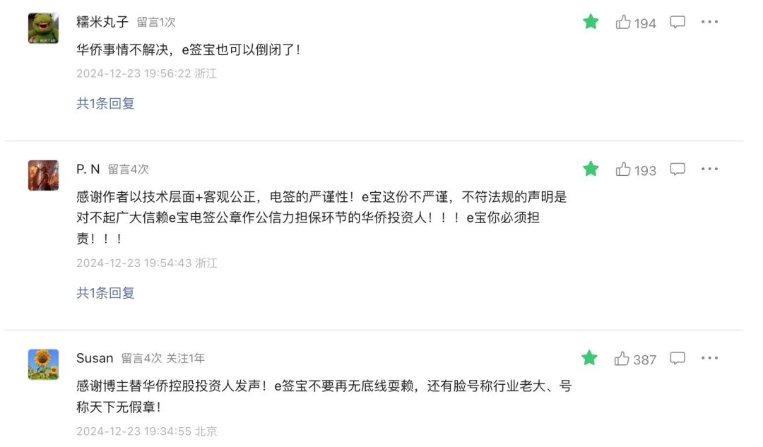自9月初“华侨系”爆雷,这个案件不断发酵,各类媒体跟进,包括有媒体曝出受害者去e签宝讨要说法、e签宝敷衍了事的视频。时隔3个月,e签宝才终于在官微上发布了严正声明,强硬表明自己没有问题,并强调:“针对不实和恶意骚扰行为,公司将通过司法途径维护自身合法权益。”2024/12/20,有媒体发文《e签宝居然真的严正声明了》,作者在文章中发了一张“荒唐”的图片,并且明确表达:“我对这个结果不意外,但我对e签宝不认错、不整改的态度意外。”该文阅读量1.2万,获赞304个,评论居然高达537条,和第一财经文章下的评论者构成很相似,大多为本案受害者。推测因涉案违法的主体华侨控股是杭州的企业,受损的投资人绝大多数都在浙江,所以评论IP集中在浙江。也有去现场讨债的个人投资者身着“中国黄金,还我血汗钱”白T恤以表达愤慨。案件涉及浙江华侨控股及其关联公司非法集资,而中国黄金集团则称其公章被伪造。在媒体的连续报道和舆论的热议下,现在受害者与公众的焦点在华侨控股旗下的科技公司冒用中鑫国际的章及e签宝的责任归属上。