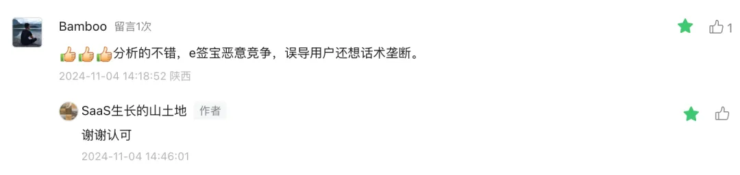 我在SaaS生长的山土地这个公号里的数篇文章中均有理有据有节地公开分析过e签宝的不实数据。e签宝现任CEO金宏洲因此起诉我侵害其名誉权,并借“涉及诉讼或仲裁”要求微信删除我的揭露其不正当竞争手段的文章,以及我写的其《请教东方富海陈利伟》文章。现诉讼已终结,本人的公众号在一审、二审中均被法庭判定无问题,驳回金宏洲相关申请。