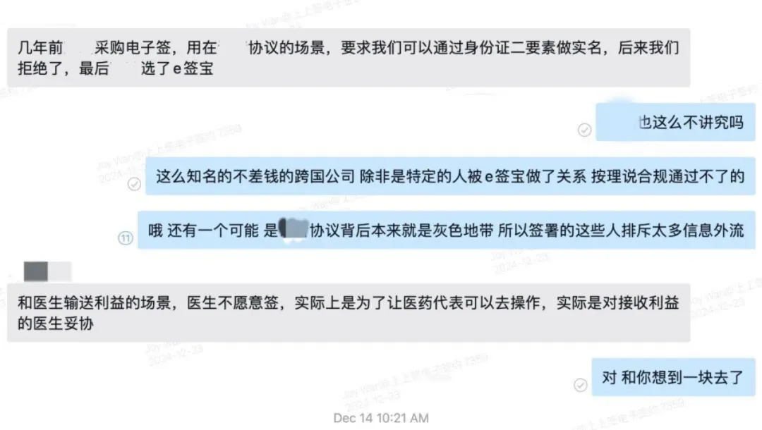 下图是第一财经报道e签宝此事后,我们的内部沟通截屏。我们的确就遇到过知名客户要求简化实名认证,但因这样无法通过上上签作为RA的合规,所以我们无奈之下只好拒绝了这家知名客户,该客户最后选择了e签宝。