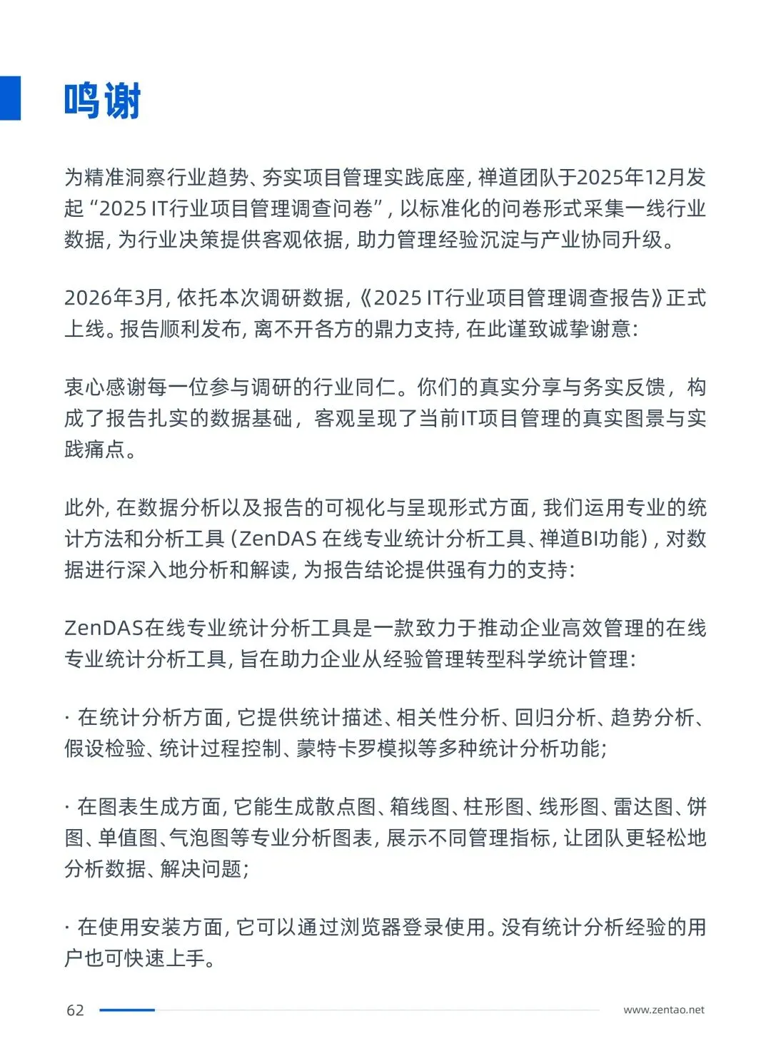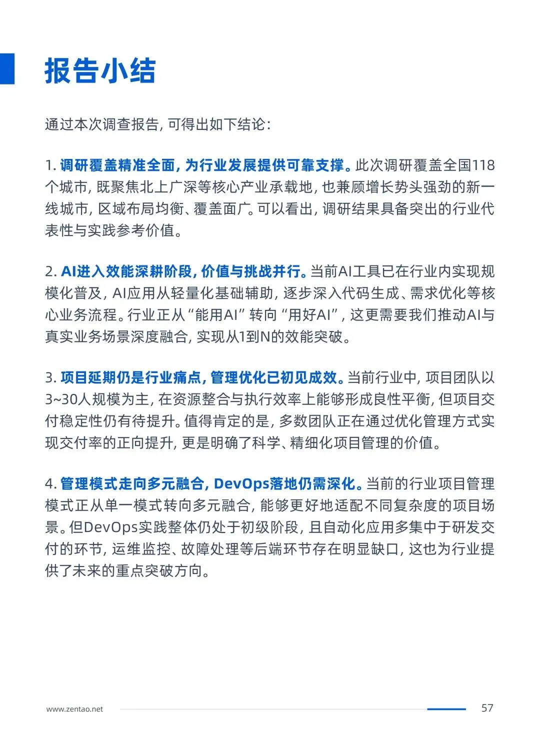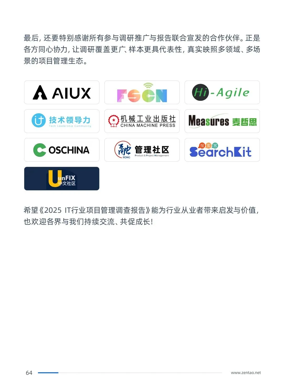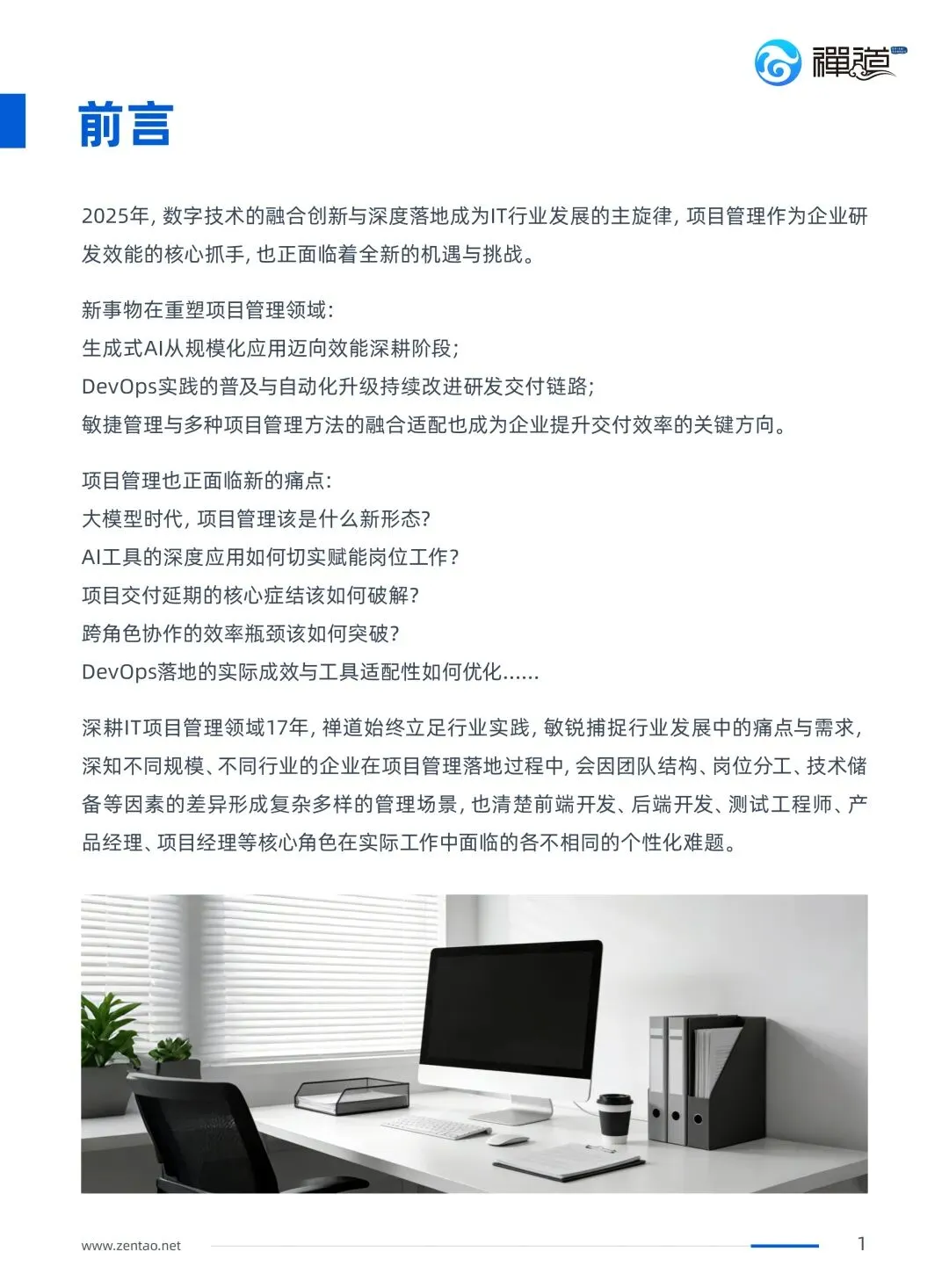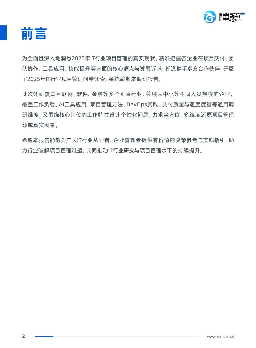 禅道团队深耕项目管理17年,其产品禅道项目管理软件集项目集管理、产品管理、项目管理、质量管理、DevOps、知识库、BI效能、工作流等功能于一体,完整覆盖从需求规划、研发执行、测试交付到运维反馈的端到端全流程。服务了国内超100万+优秀团队,本次调查报告的所有数据均来自一线从业者的真实反馈,希望能为每一位IT人、每一家企业提供有价值的决策参考。