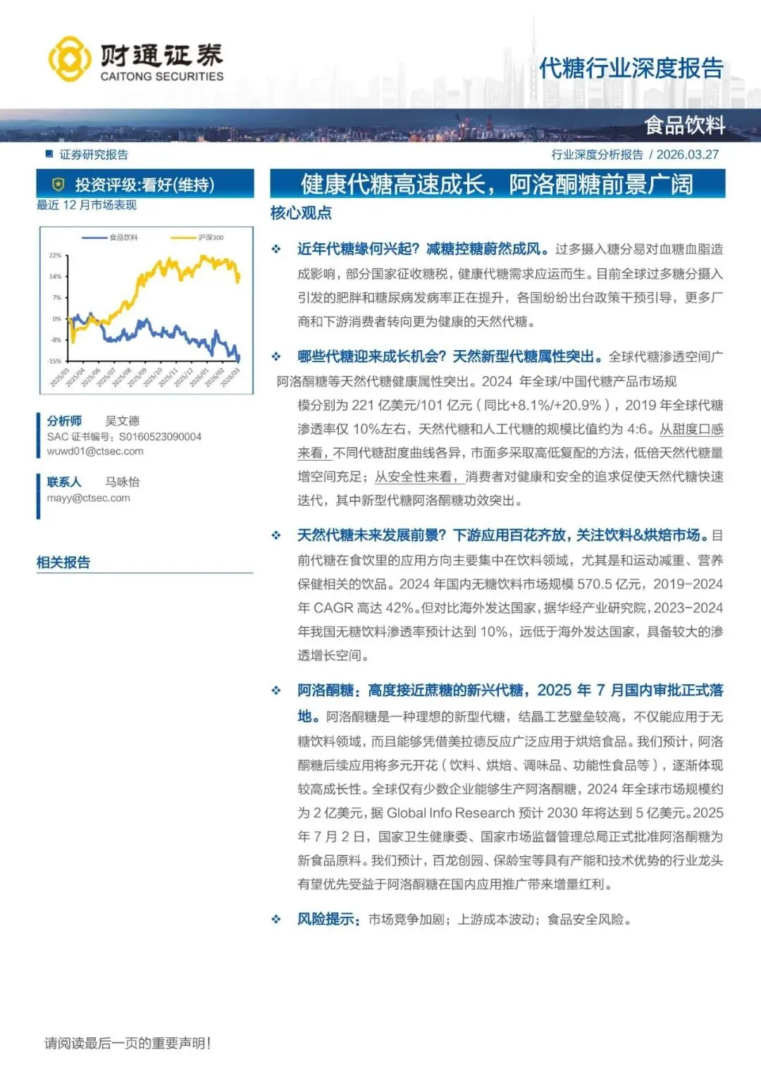 代糖行业深度报告:健康代糖高速成长,阿洛酮糖前景广阔-260327-财通证券-20页