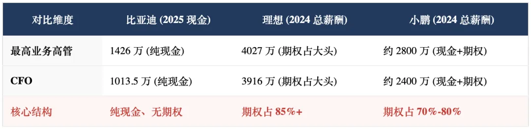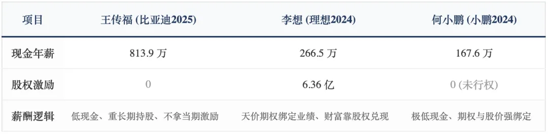 理想高管薪酬在 4000 万级别,其中 85% 以上来自期权;李想本人 6.39 亿薪酬中,现金仅 266 万。小鹏创始人低薪、高额期权且条件苛刻。本质上,新势力是把个人回报与公司市值进行了深度绑定。