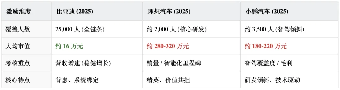 一、先来看看比亚迪和理想、小鹏的薪酬激励数据