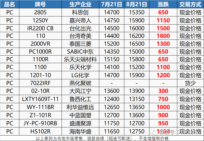 由于原油连涨,塑料板块也被带动上行。PC、PP、PE、PVC、PET等关联塑料最高月涨2350元/吨。