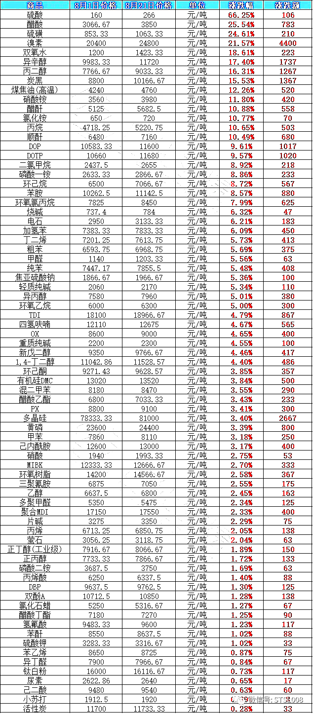 涨幅榜:涵盖硫酸、醋酸、双氧水、原油、烧碱、环氧树脂、有机硅、钛白粉等多个产业链,其中硫酸暴涨66.25%,醋酸、硫磺、溴素、双氧水、异辛醇、丙二醇、炭黑等产品涨幅均超过15%。