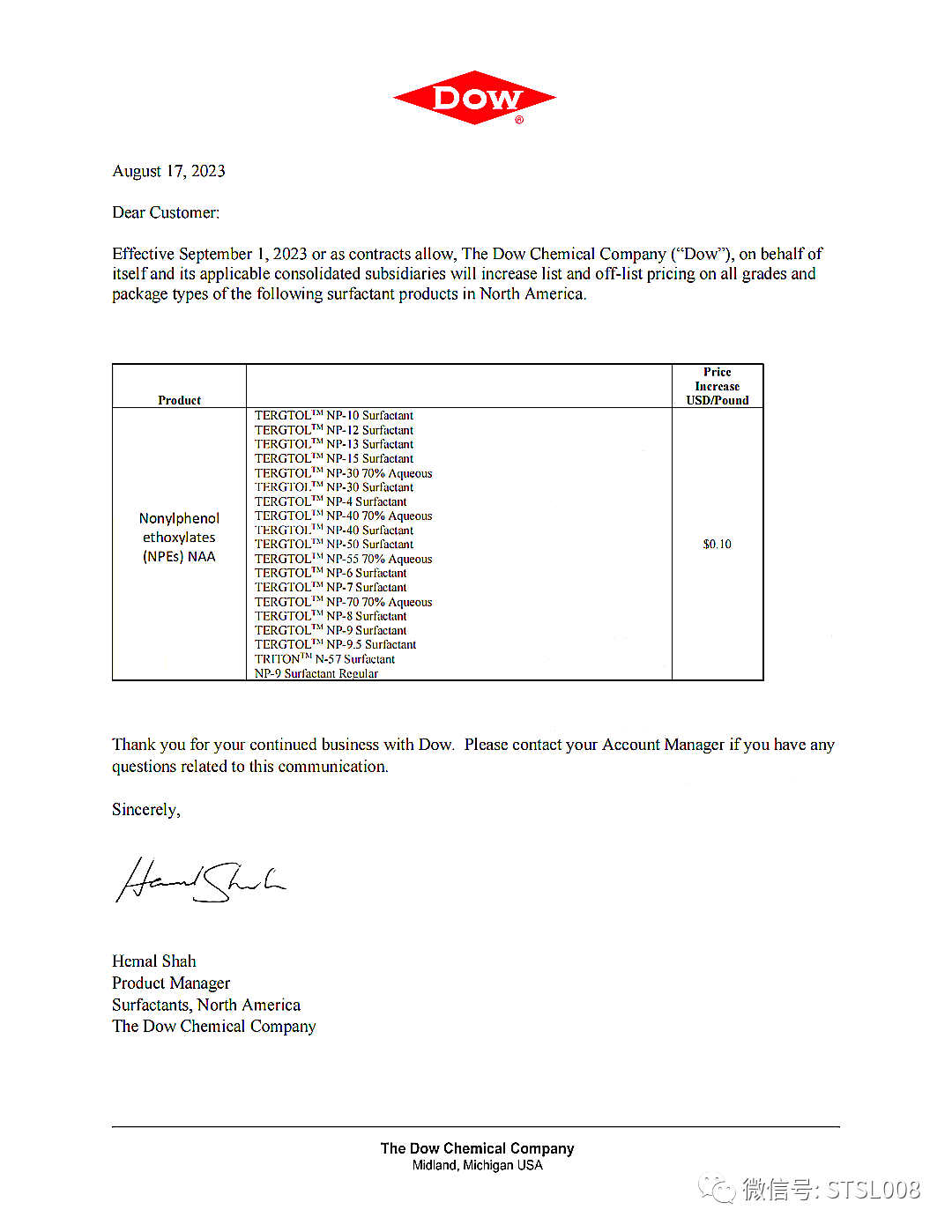 此外,陶氏化学发布涨价函称,自9月1日起上调北美地区所有等级和包装类型的表面活性剂价格,最高涨幅为0.1美元/磅(约合人民币1612元/吨)。