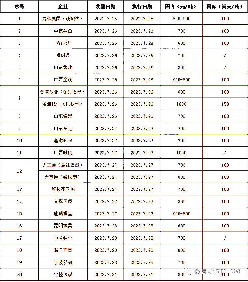 龙佰集团、中核钛白、广西金茂等20多家钛白粉企业宣布涨价,国内上涨幅度在600-1000元/吨,国际上涨幅度100美元/吨。