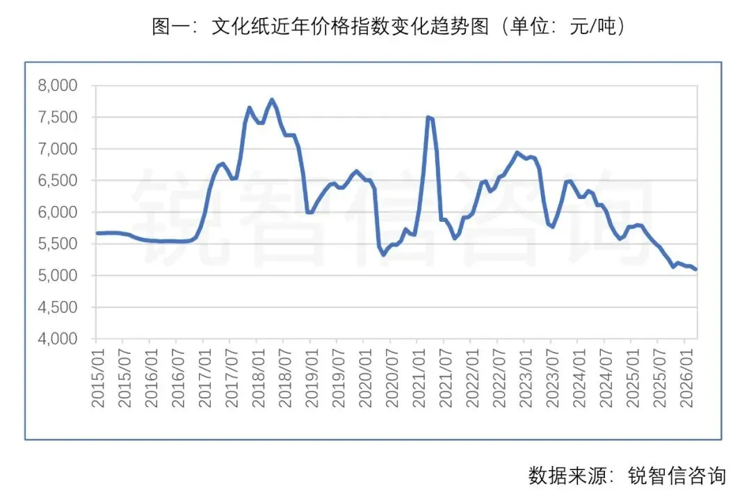 文化纸(非涂布印刷书写纸)作为国内消费量仅次于箱板纸和瓦楞原纸的纸种,虽然与其它纸种一样,同样面临着产能利用率低的全行业困难,但从近年各纸种价格变化趋势的表现来看,文化纸显得更为惨烈:价格指数不仅从2025年开始走出单边下行态势,即便中途偶有反弹也只是溅起小小浪花后继续下行,而且于2026年3月触达十年最低点5097.5,较十年来最高点7775.8(2018年4月)跌去34.4%(如图一)。