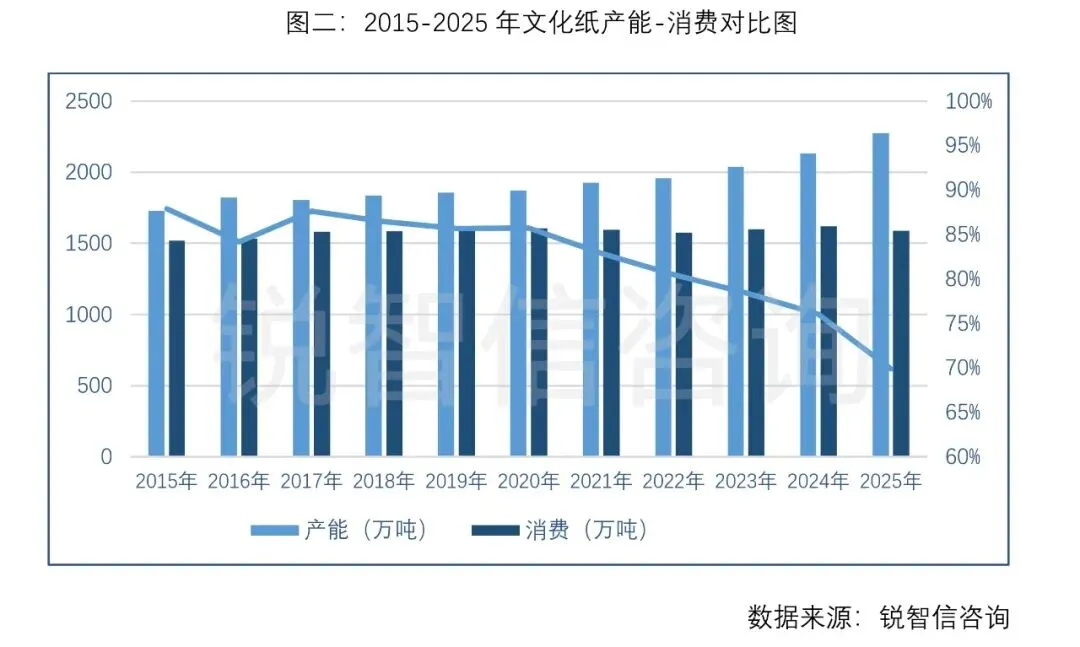 价格指数表现的惨烈是“果”,产能高歌猛进和消费停滞不前的双管齐下,造成的消费量产能比持续下滑才是“因”(如图二)。据锐智信《中国浆纸行业全景报告(2026版)》统计数据:2015年-2025年,产能累计增长率达31.7%,但同期的消费累计增长率只有4.7%,尤其在2025年,因文化纸占比超四成的本白类双胶纸用量锐减而拖累整个文化纸消费量水平回到2018年,并且有进一步下降的趋势。