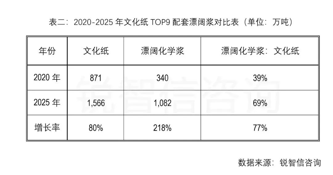 2025年,TOP9的文化纸产能较2020年增长80%,但漂阔浆产能猛增到1082万吨(含晨鸣),增长率218%,“漂阔浆:文化纸产能比”从39%飙升至69%(如表二,完全自给的APP和亚太视同浆纸等比计入)。