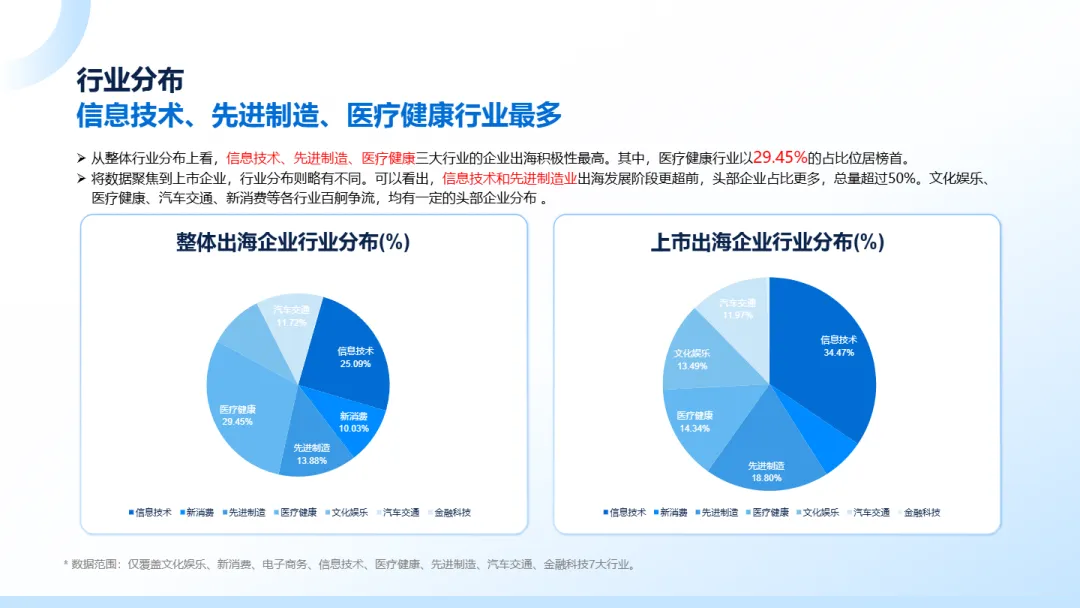 • 信息技术、先进制造、医疗健康为出海主力军:整体出海企业中,医疗健康占比最高(29.45%);而上市出海企业中,信息技术(34.47%)与先进制造(18.80%)占据主导地位,反映科技与高端制造类企业全球化程度更高、资本化能力更强。