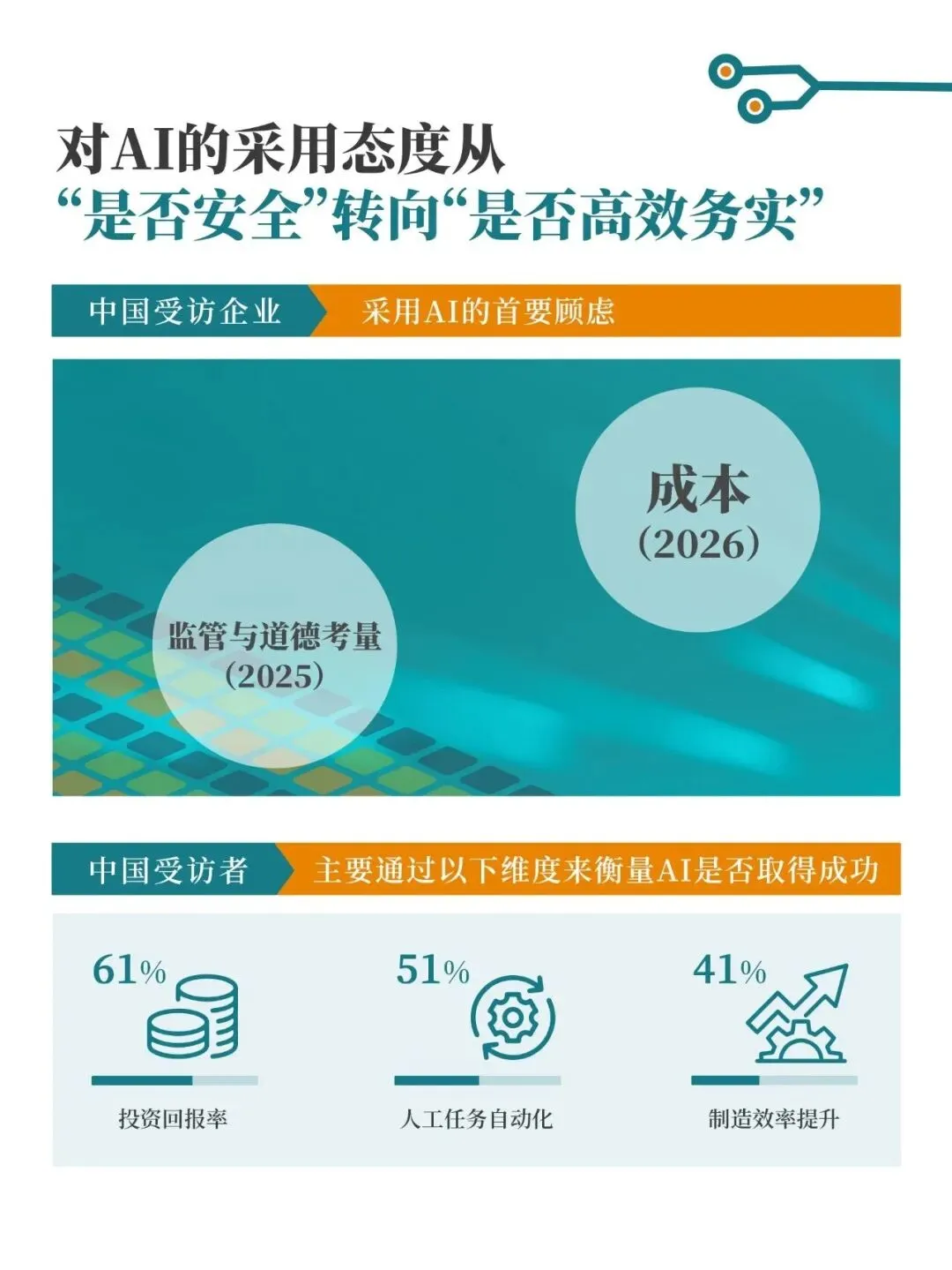 今年调研覆盖了中国、德国、印度、日本和美国的受访者,结果显示AI技术的采用仍在持续扩展。数据显示,行业技术企业的AI采用率已突破80%。随着AI工具日益深入企业日常运营,企业也开始要求AI投资带来明确的回报。