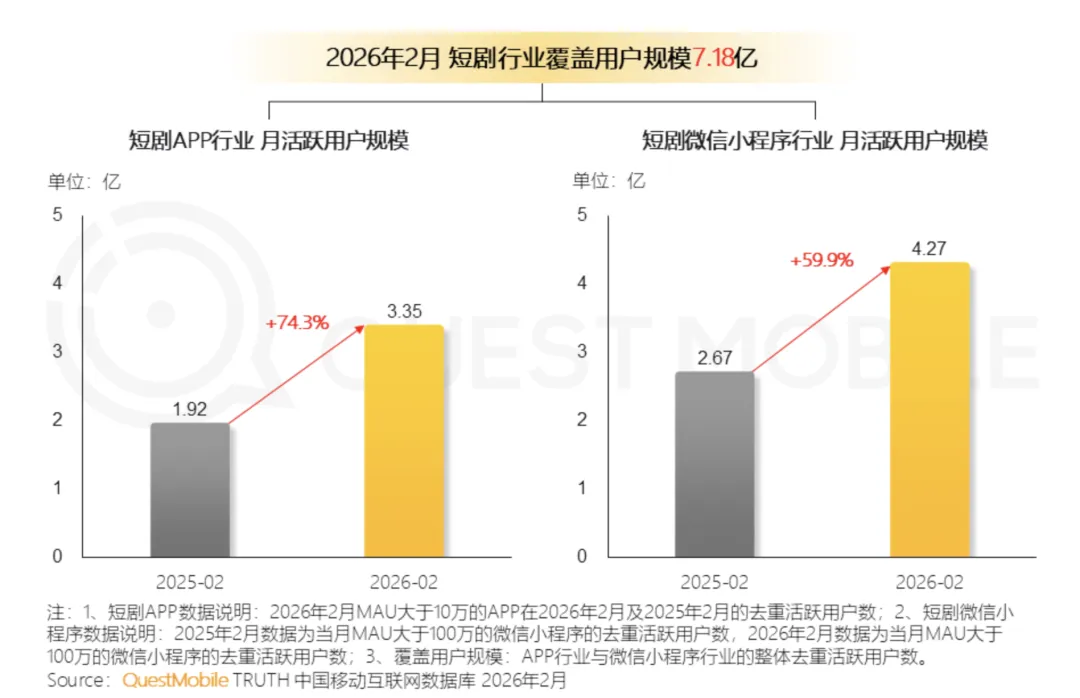 截至2026年2月,短剧行业用户规模持续攀升,渠道分化明确: