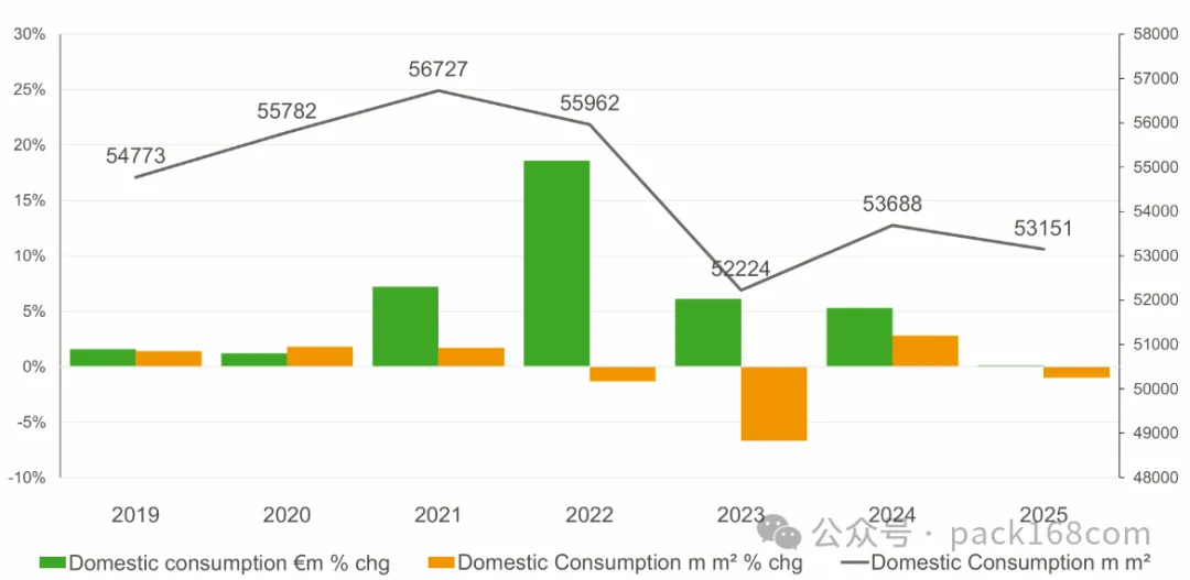 2025年欧洲软包装市场消耗量约为531.51亿平方米,较2024年的536.88亿平方米略有下滑。从价格端来看,原材料整体价格在高位之后回落——BOPP、BOPA、PET膜等主流薄膜均出现价格下调,PE和LDPE也处于相对疲软状态。
