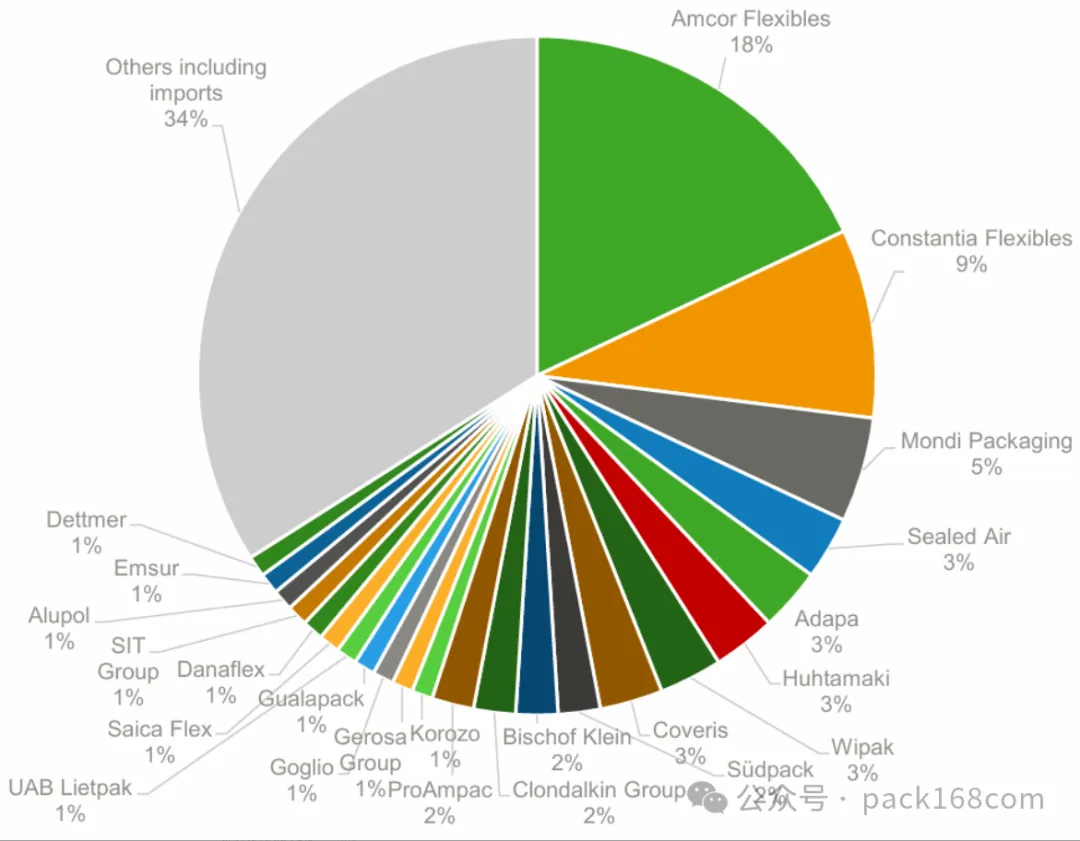 市场格局高度集中——Amcor Flexibles以18%的市占率稳居第一,Constantia Flexibles(9%)和Mondi(5%)紧随其后,其余34%则分散在大量中小企业和进口产品之间。