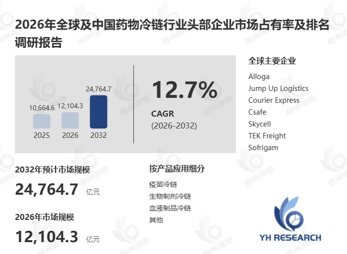 根据YH恒州诚思信息咨询调研统计,2025年全球药物冷链市场规模约10665亿元,预计未来将持续保持平稳增长的态势,到2032年市场规模将接近24765亿元,未来六年CAGR为12.7%。