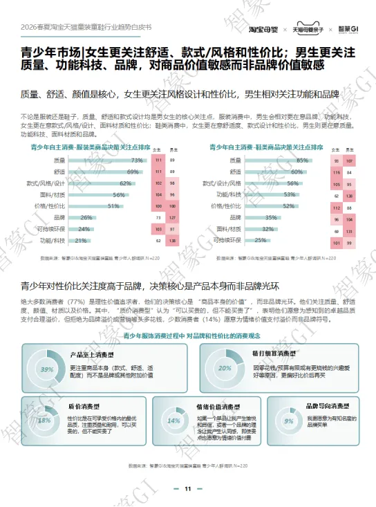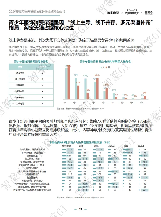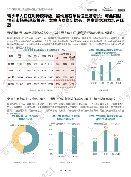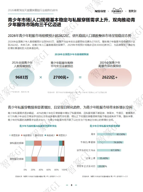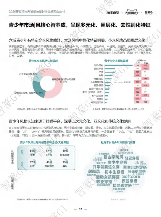 2026春夏淘宝天猫童装童鞋行业规模稳步增长,线上成主渠道,90/95后家长为消费主力,青少年与婴幼童市场潜力突出。政策利好、安全标准升级推动行业规范发展,消费呈现品质化、精细化、场景化趋势。2026春夏推出新预科风、柔系美式、盐系户外等八大核心风格,成人时尚下沉童装周期缩短。亲子赛道向品质化、全场景延伸,运动户外、节日仪式感成热点,设计摆脱同质化。IP赛道持续增长,小童偏好动漫卡通,中大童青睐游戏、文化IP,鞋服+谷子周边成新玩法。品类上,裤子、T恤等为核心,功能与面料持续升级,童鞋按成长分阶设计,溯溪鞋、分阶运动鞋等成趋势。
