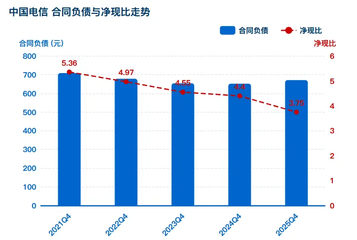 合同负债同比增长 2.96;虽然净现比持续下降,但中国电信净现比依然是三家公司中最高的。