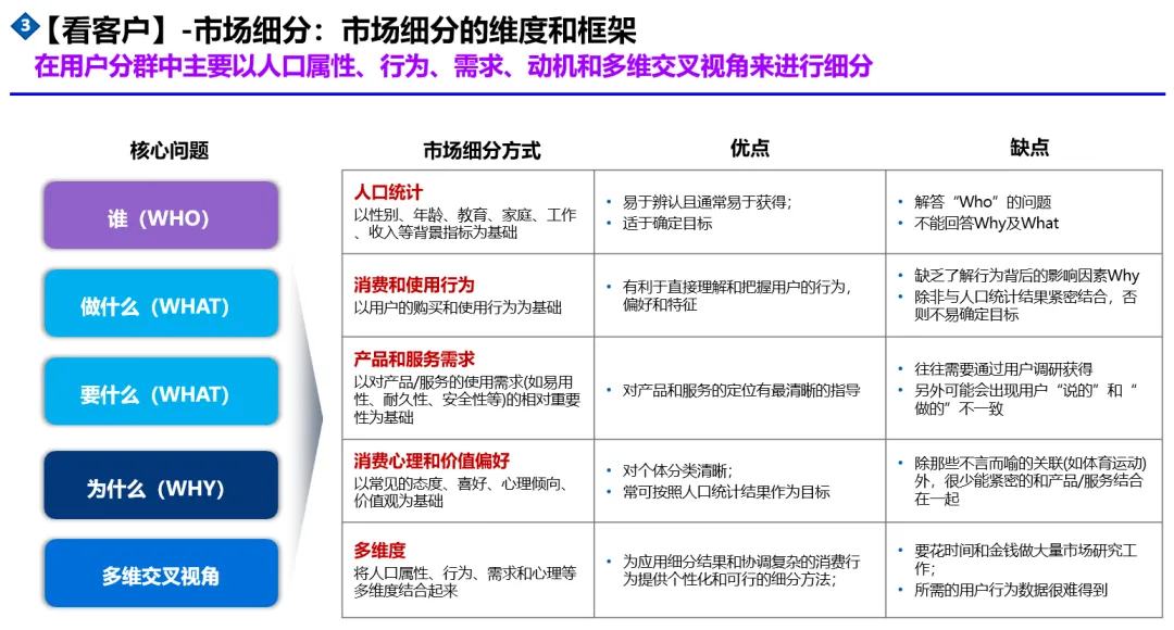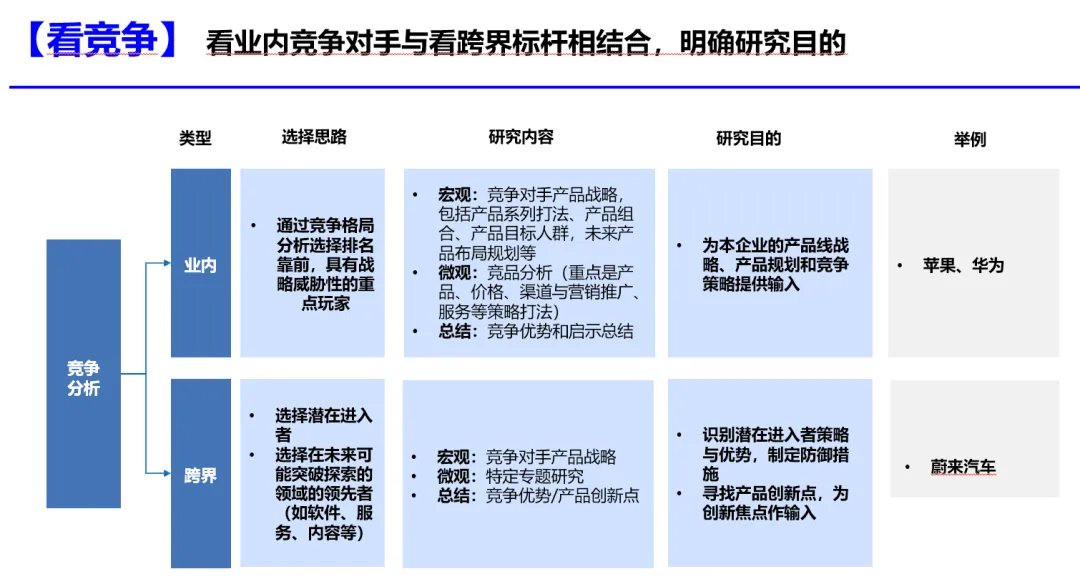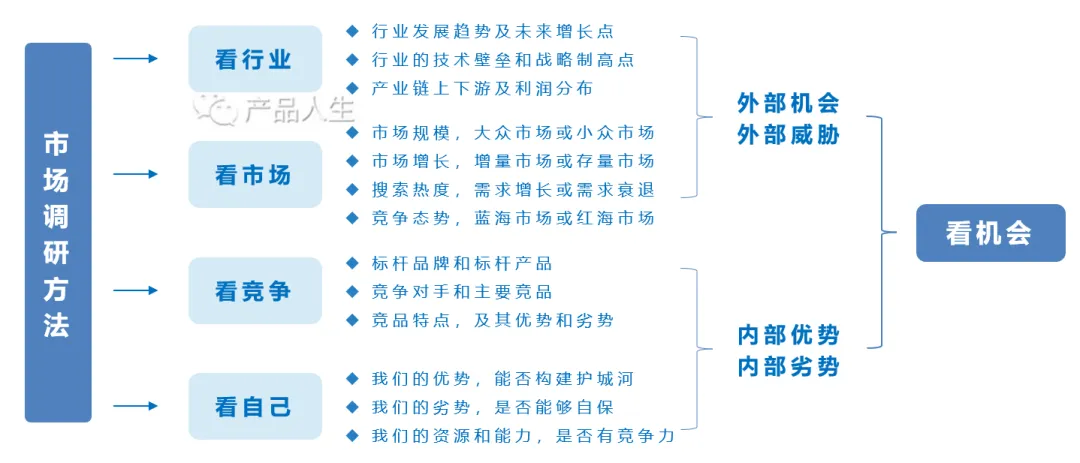 看行业、看市场:是宏观分析,目的是识别企业外部的机会和威胁; 看用户、看竞争:是中观分析,目的是洞察用户需求和竞争态势; 看自己:是微观分析,目的是通过分析企业外部的机会和威胁、以及内部的优势和劣势,找出适合我们的市场机会。