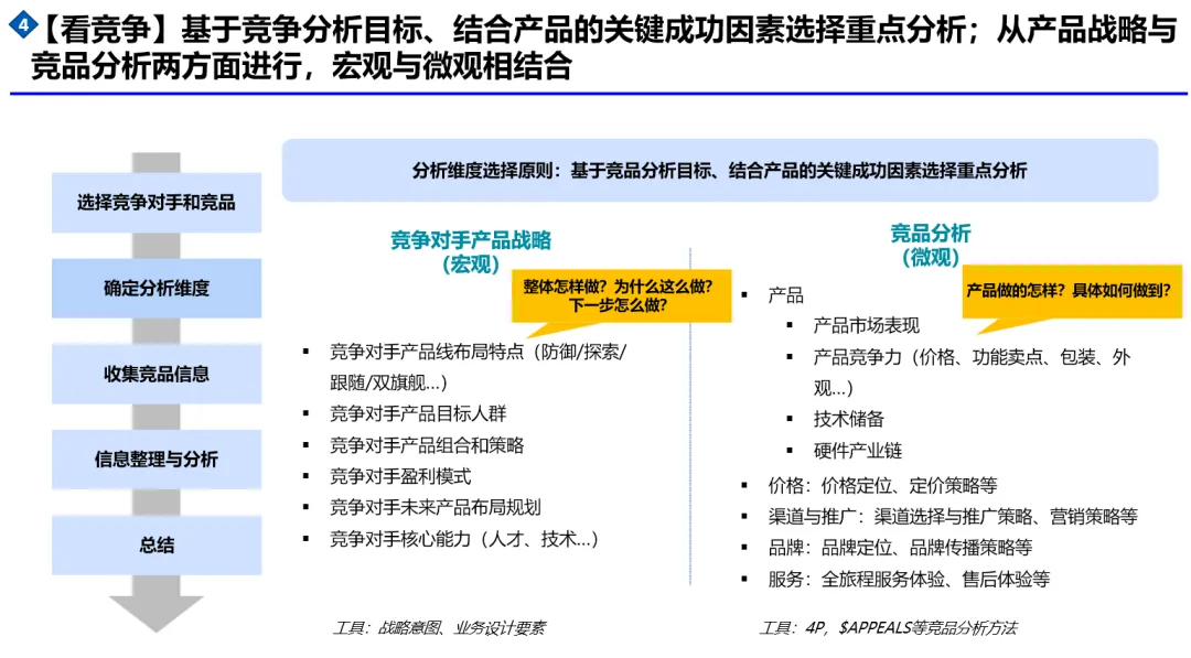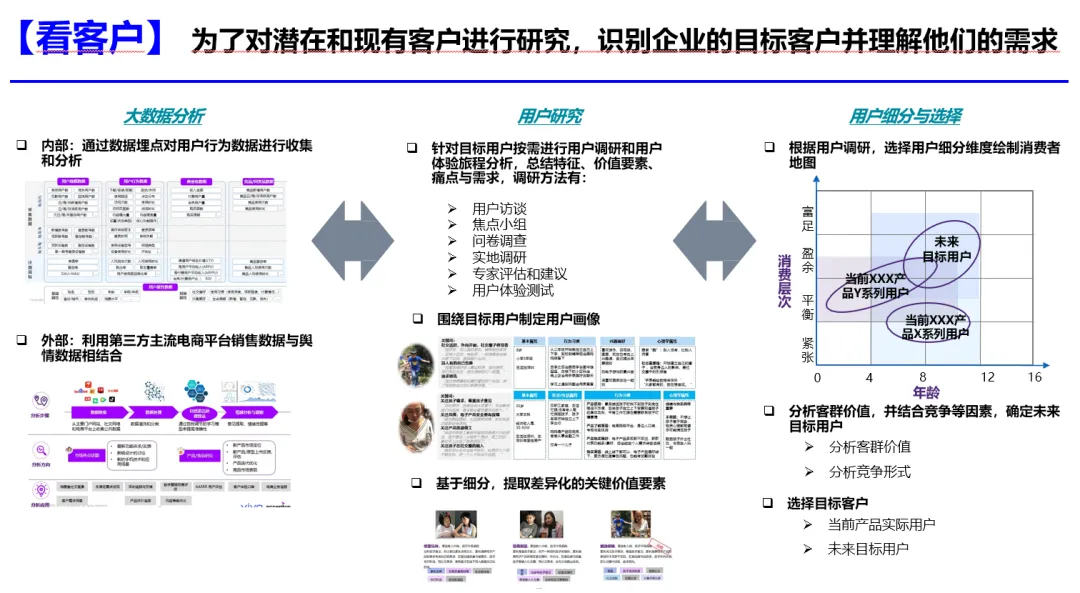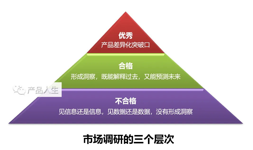 这个层次的市场调研,已经形成了市场洞察,清楚地知道:市场机会是什么,威胁是什么;竞争格局怎么样;竞品优势是什么、劣势是什么;客户痛点是什么……