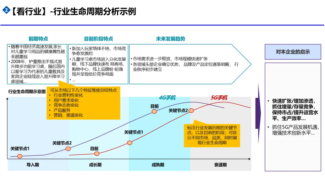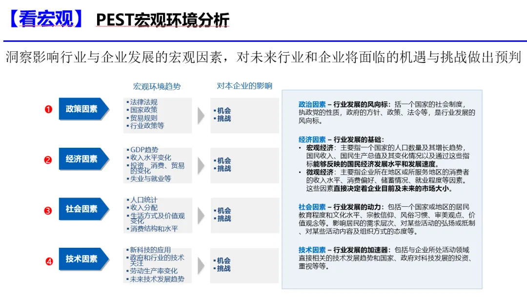 进行宏观分析,深刻理解行业、市场和竞争环境,找出发展规律,预判未来发展趋势; 发现和筛选市场机会,论证所选的赛道和产品,是否存在市场机会,是否值得投资; 形成市场洞察,为企业的战略规划、路标规划和产品规划,提供信息输入。