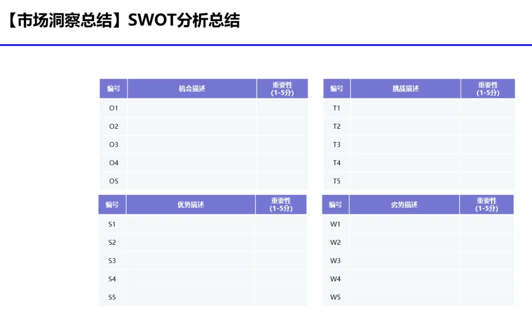 综合分析判断:用结构化的分析框架和工具方法,对机会威胁和优势劣势,进行综合分析比较,形成市场洞察。