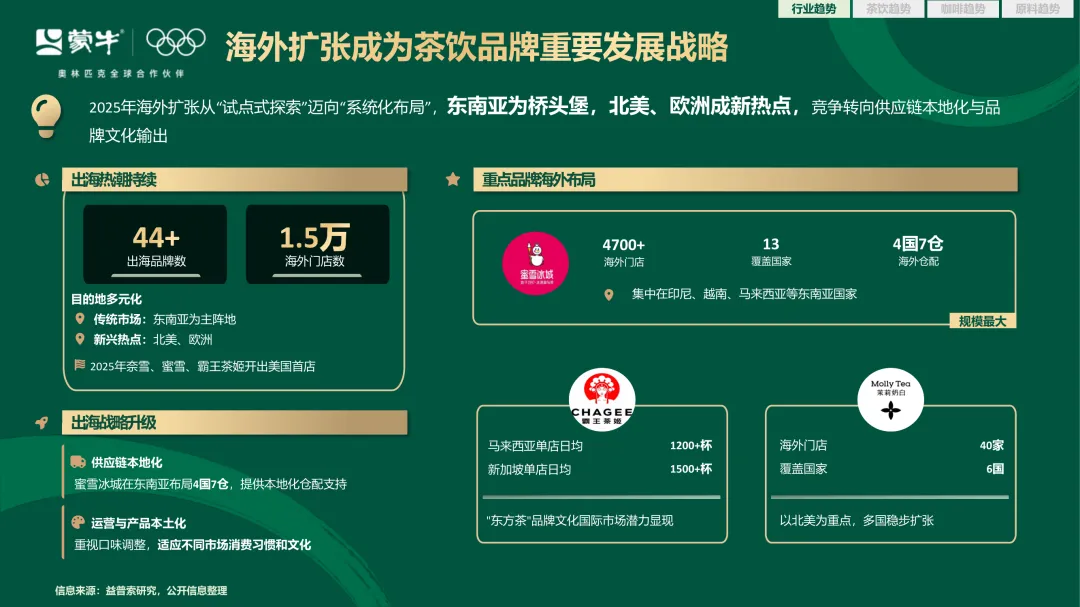 •海外扩张系统化:头部品牌(如喜茶、奈雪)的海外布局从“试点”转向“系统化”,东南亚是桥头堡,北美、欧洲成新热点,竞争转向供应链本地化和品牌文化输出。