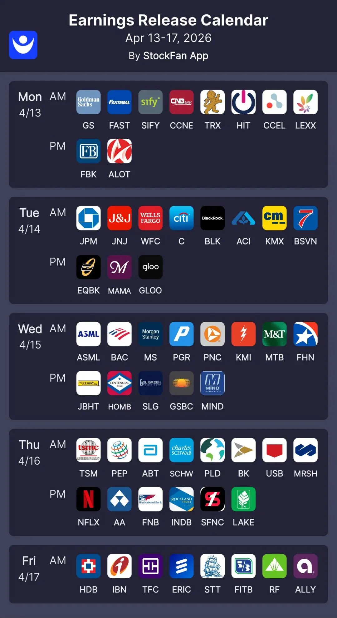 本周4.13-17日美股Q1重磅财报日历: