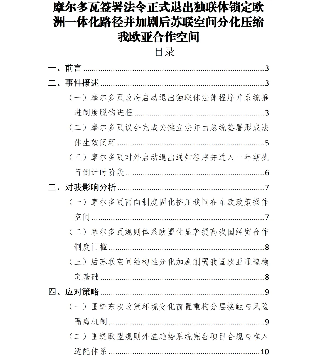 这一动作发生在摩尔多瓦连续多年削减对独联体依附、加速对接欧盟规则体系的背景下,体现其对外制度选择已由政策导向转入法律锁定阶段。伴随区域多边框架弱化与地缘结构分化加剧,该举措正在重塑东欧与后苏联空间的合作格局与制度边界,相关连锁效应已对区域稳定性与外部合作环境形成现实冲击。