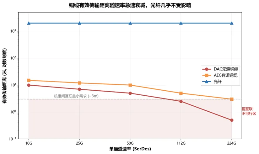 ⚠️ 224G SerDes时代,AEC铜缆有效距离缩短至2-3米,仅覆盖机柜内短距离——机柜间互联必须转向光方案,铜缆的"可用场景"持续缩小,这是CPO被重视的根本物理原因。
