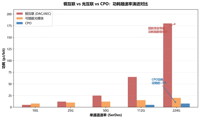 :在112G SerDes速率下,无源铜缆有效传输距离仅2-3米;224G SerDes时代,AEC有源铜缆有效距离缩短至2-3米,仅覆盖机柜内短距离,机柜间互联必须转向光方案。趋肤效应导致功耗随速率呈指数级增长。 - CPO是高密度AI互联场景的核心演进方向