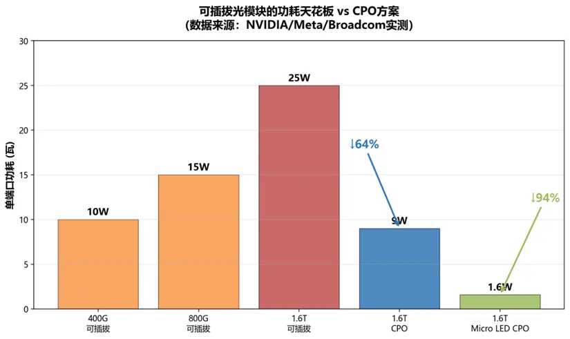 以一个万卡AI训练集群为例:假设采用H100 GPU,每张GPU需要6个光模块进行互联,整个集群需要约6万个光模块。仅光模块采购成本就超过3亿美元,功耗超过1MW——这还只是800G时代的数据。当速率升级到1.6T/3.2T时,如果继续沿用可插拔光模块,功耗和密度将成为无法承受的负担。