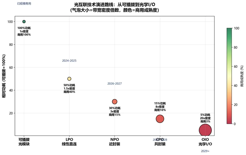 图4:光互联技术演进路线(气泡大小=带宽密度倍数,颜色=商用成熟度)
