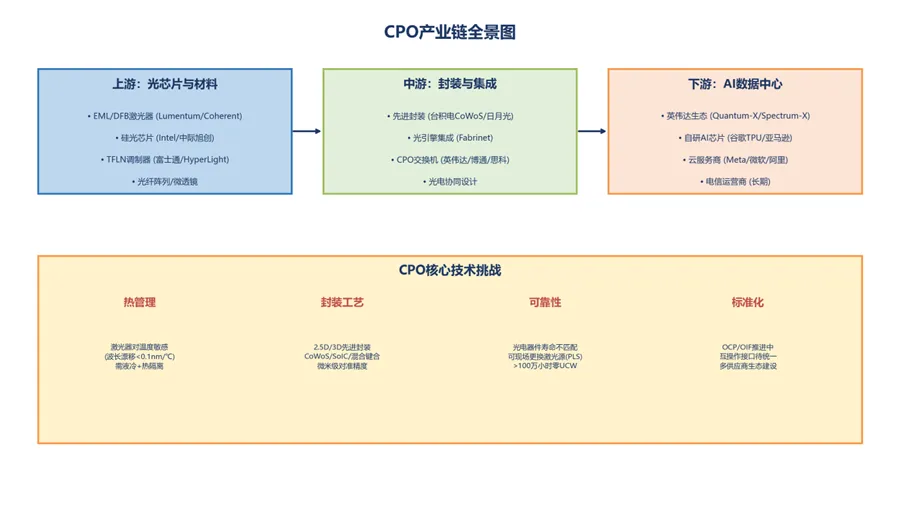:Meta、微软、阿里云、腾讯云等云服务商的数据中心网络升级,是CPO在中长期的重要需求来源。当800G/1.6T可插拔光模块的功耗和密度无法满足需求时,CPO将成为必然选择。