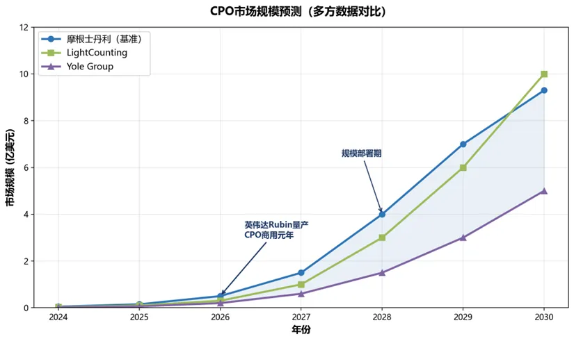注意:不同机构对"市场规模"的统计口径差异较大——摩根士丹利口径为CPO光引擎及模组市场,LightCounting含3.2T端口及配套,Yole为保守估计仅CPO模组。读者在做跨机构比较时需注意口径差异。