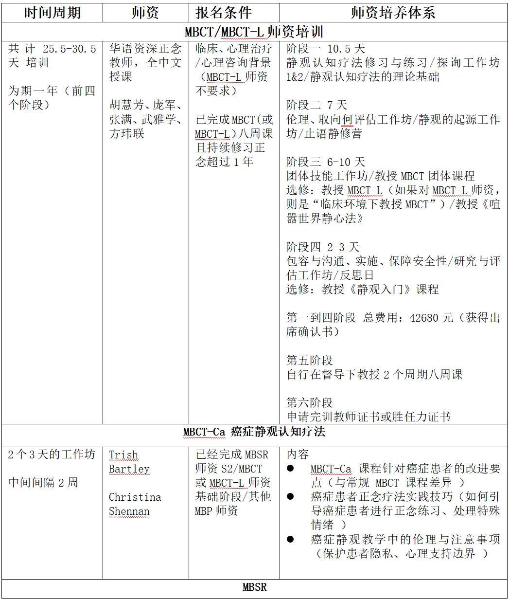 除了基本的MBSR师资,中科博爱依托牛津静观中心的训练方法,提供三种深度培训课程:MBCT(正念认知疗法)、及MBCT-L(生活中的静观)以及MBCT-Ca(癌症静观认知疗法)。其MBSR师资和布朗大学合作,完成S2课程将将列入布朗大学静修中心(MC@B)成立的全球静观协力联盟(GMC,Global Mindfulness Collaborative)官网,证书由心愿度机构和授课老师签发。MBCT/MBCT-L师资培训的的出席函、完训证书由牛津静观和中科博爱联合签发,完训学员课在OM官网查询,通过两轮读到后可申请TTC认证。静观委员会下设“MPC 静观注册系统”,完成师资培训和伦理培训,通过伦理公示后,可注册成为静观师并获得师资展示机会,提升其公信力和职业资格认可度,继续教育课程也可申请静观专委会颁发的学分证书。中科博爱也会与OM联合组织完训师资主题见面会,自2024年11月至2025年8月已举办3期。