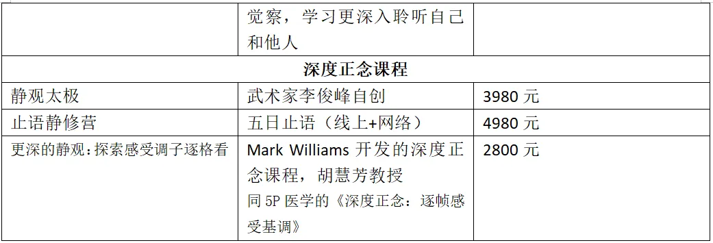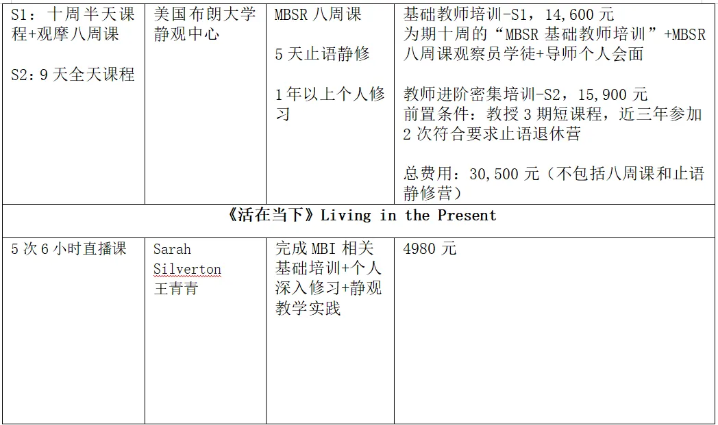 此外中科博爱也开展未成年人养育相关的正念师资课程,比如《活在当下》Living in the Present师资,并与海蓝之家合作招募青少年静观自我关怀师资课(MSC-T,6整天,1.5万元),与广州觉念工作室合作招募其自研的儿童静观大脑开发课程的师资培训(4天,4200元)。